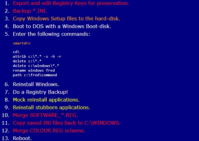 Despite the fact I don't approve of this method, if you did try it, it's probable that you would be so impressed by the fresh turn of speed of speed to your Windows setup that you would want to do it more frequently; perhaps every few months, or even every few weeks. Thus routine will render repeating the above steps irritating, mundane and time-consuming, but nevertheless, rewarding. I faced this problem, so I developed ways to make reinstalling Windows less of a headache, they are detailed below.