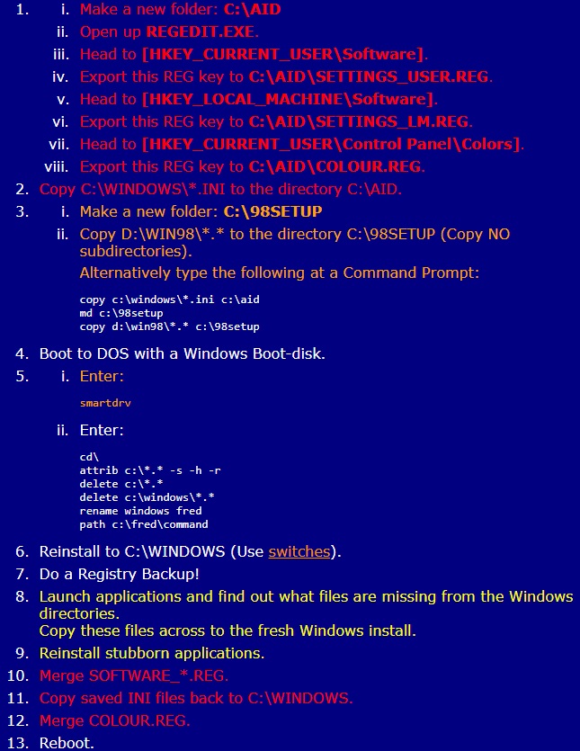 Here I put all of the above together to make following the entire process easier. The individual sections are colour coded for clarity, the steps that are necessary to achieve a standard clean install (without format) are displayed in white.